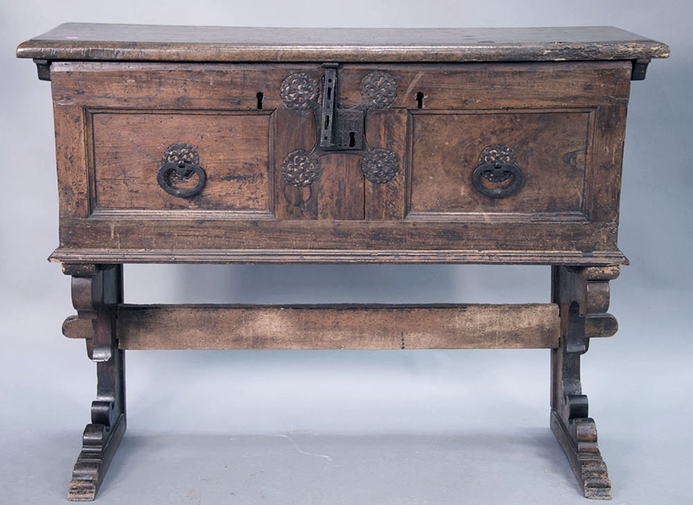 Italian lift top chest having inlaid rectangular lift top opening to reveal inlaid interior lid, false bottom, and two tills, front having two panels with large hand etched iron decorations and lock all on stand with tressel type base, walnut probably 17th century. ht. 37 in. wd. 43 in. dp. 14 1/2 in.