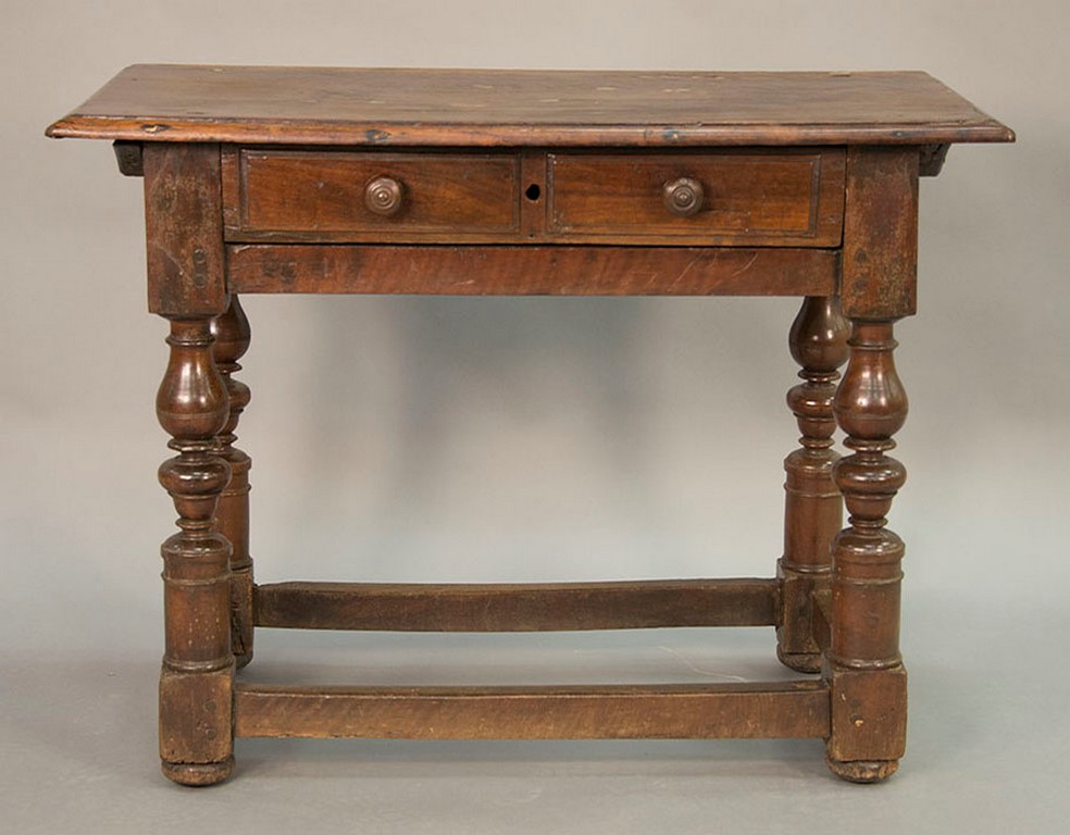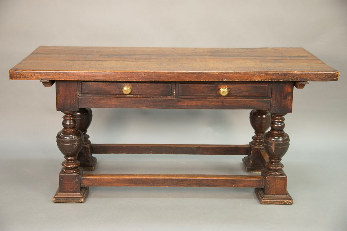 Italian center table having rectangular top with drawer in frieze on bold turned legs joined by box stretcher and turned feet, Italian 17th century. ht. 31 1/2 in. wd. 34 1/2 in. dp. 22 in.
