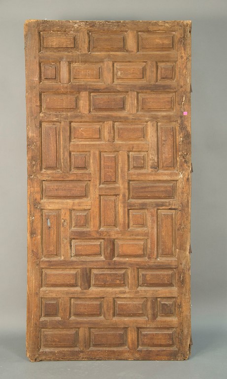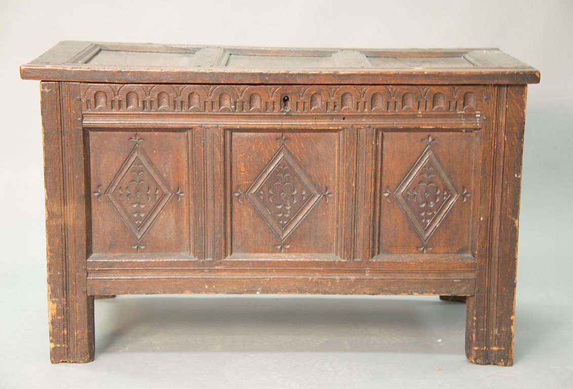 Oak lift top chest, top with snipe hinges and plain panels over carved paneled front, probably English 18th century. ht. 32 1/4 in. wd. 36 in. dp. 18 1/4 in.