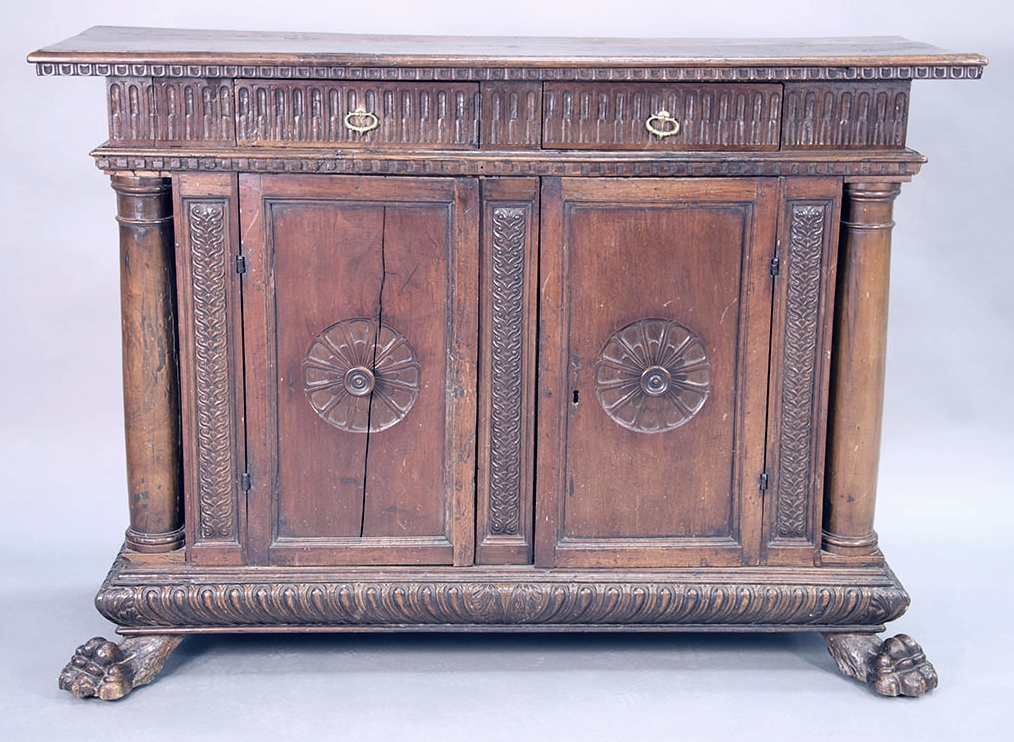 Italian walnut sideboard having rectangular top over conforming case with carved frieze having two drawers over carved doors flanked by large turned columns with carved skirt all on large paw feet, Italy probably 17th century. ht. 49 in. wd. 59 in. dp. 23 in.