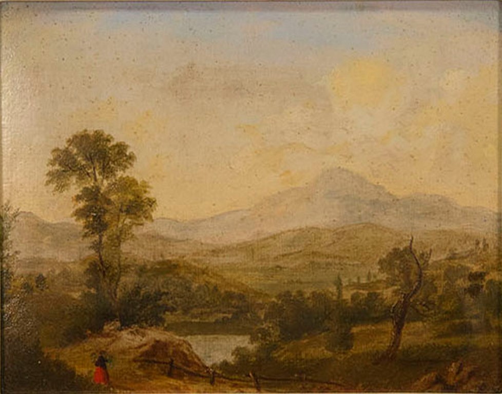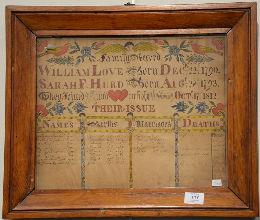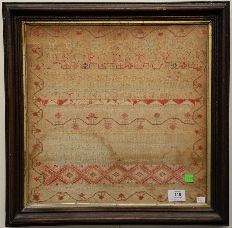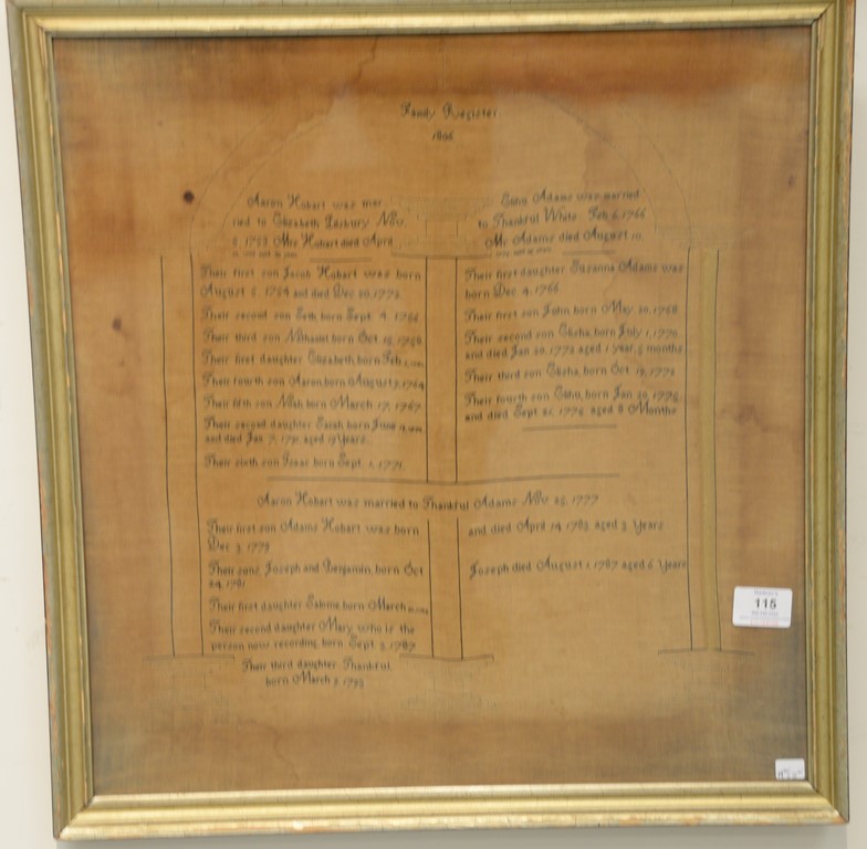 Needlework sampler, Ann Magdalen Yates, her work with several people, houses and trees including a cherry picker, silk and linen, probably N.Y. City, early 19th century. 19 1/8 x 15 5/8 Featured in Antiques Magazine, February 2005 as N.Y. Born April 6, 1790 1800-1805.