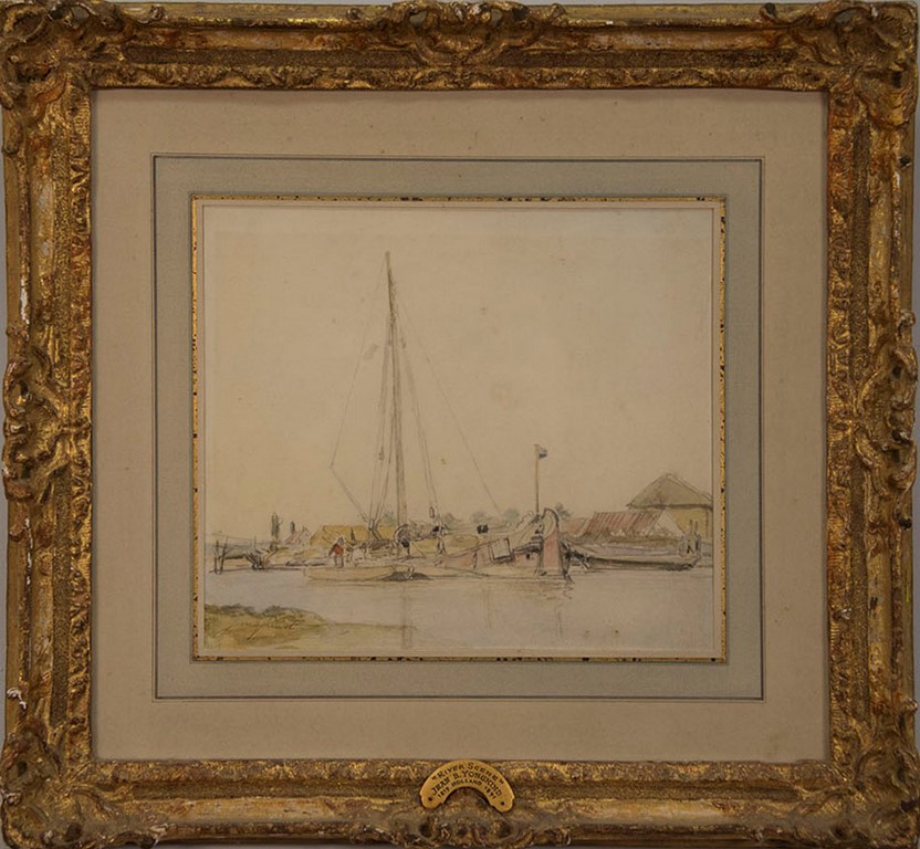 JOHAN J. BARTHOLD JONGKIND 1819-1891 River Scene watercolor and pencil on paper signed lower left Jongkind Hammer Galleries stamp on verso #20408-4 8 1/4 x 9 3/4 Provenance: Hammer Galleries 1968 Current Private Collection Exhibited: Hammer Galleries – Drawings by the Masters December 9 through December 27, 1968 Included Documentation: Copy of Hammer Galleries original bill of sale June 14, 1968. Copy of Hammer Galleries Drawings by the Masters December 1968 edition photograph #34. Also being sold with original folder from Hammer Galleries containing letter with Hammer Galleries #20408-4, title, artist name and biography, and photograph.
