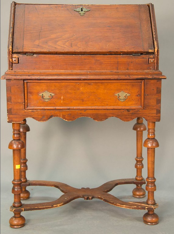 Queen Anne desk on frame having slant lid desk on lower section with one drawer and scalloped skirt on turned legs with flat X stretcher set on suppressed ball feet, pine and hard pine, 18th century. ht. 39 1/2 in. lower case wd. 27 in. dp. 17 3/4 in.
