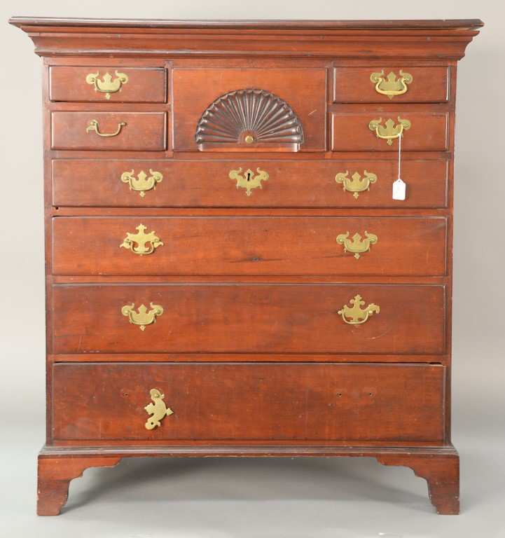 Chippendale cherry chest having cornice molded top over fan carved center drawer flanked by two short drawers on either side over four long drawers on cutout bracket feet, with original hardware, circa 1760. ht. 43 in. wd. 35 1/2 in. dp. 19 1/2 in.