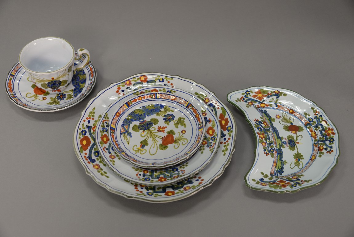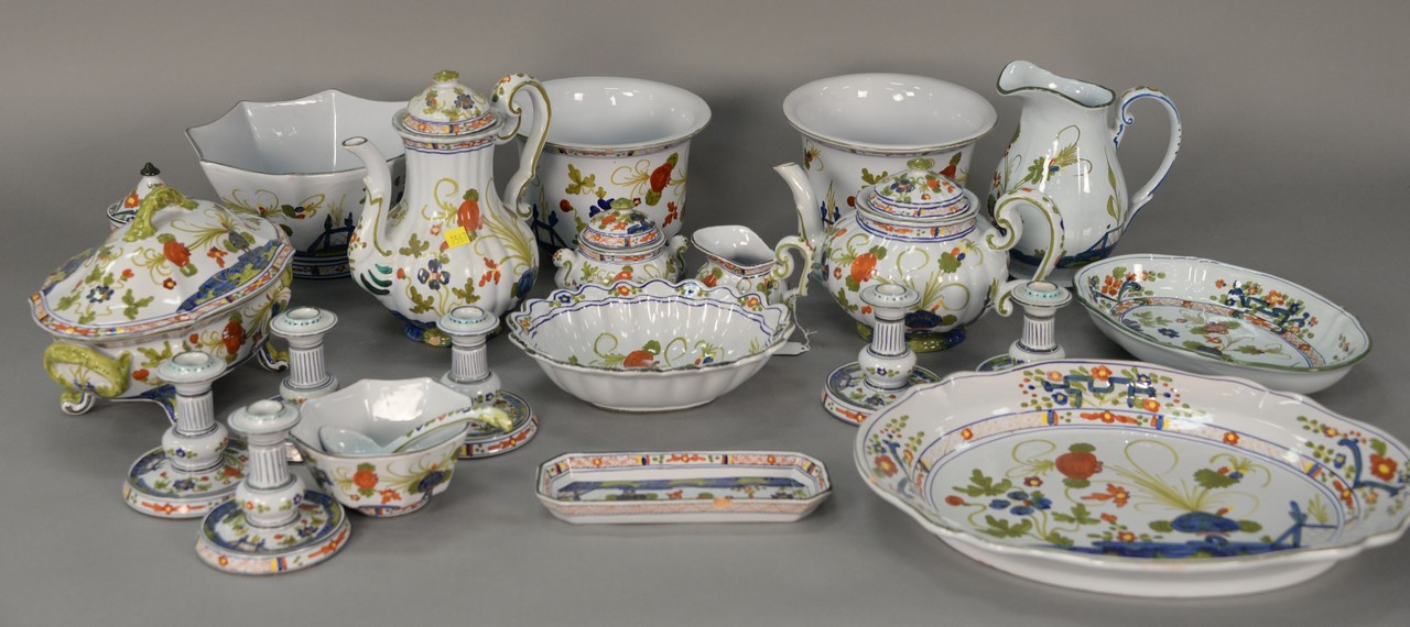 Garofano Faenza Blue Carnation Italian Pottery dinner set, setting for 18 to include 18 dinner plates, 18 dessert plates, 18 bread plates, 20 cups, 17 saucers, 6 small plates, and 8 bone dishes, 105 total pieces.