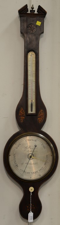 B. Bordoli wheel barometer having inlaid mahogany case with conch shell and sun inlay, dial marked B. Bordoli Andover Warranted. ht. 38 1/2 in. wd. 10 in.