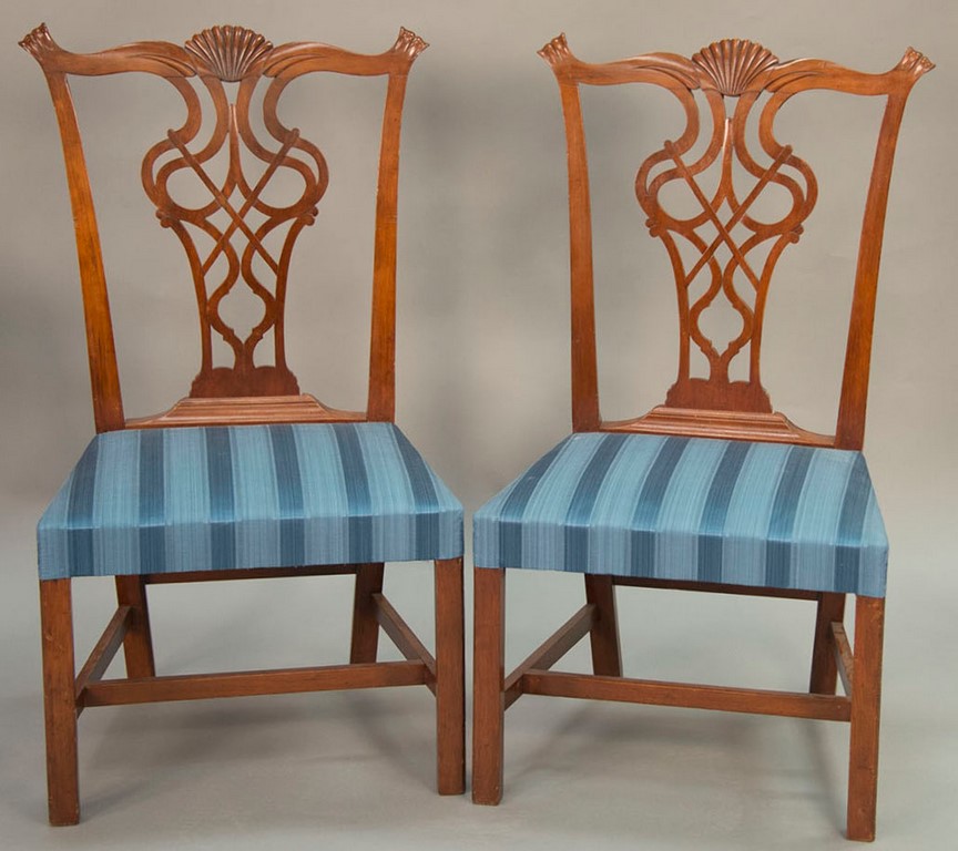 Pair of Chippendale cherry side chairs each with shell carved crest rail over pierced carved splat with crossed bars over fully upholstered seats on square legs joined by H stretchers, attributed to Eliphalet Chapin, East Windsor, Connecticut circa 1780. Chairs closely resemble side chair #242 in CT Furniture, 17th and 18th centuries in Wadsworth Atheneum Collection. ht. 38 1/4 in. seat ht. 16 1/4 in. Provenance: Nathan Liverant & Son The Estate of Sylvia Leven Included Documentation: Copy of Original Bill of Sale 1993