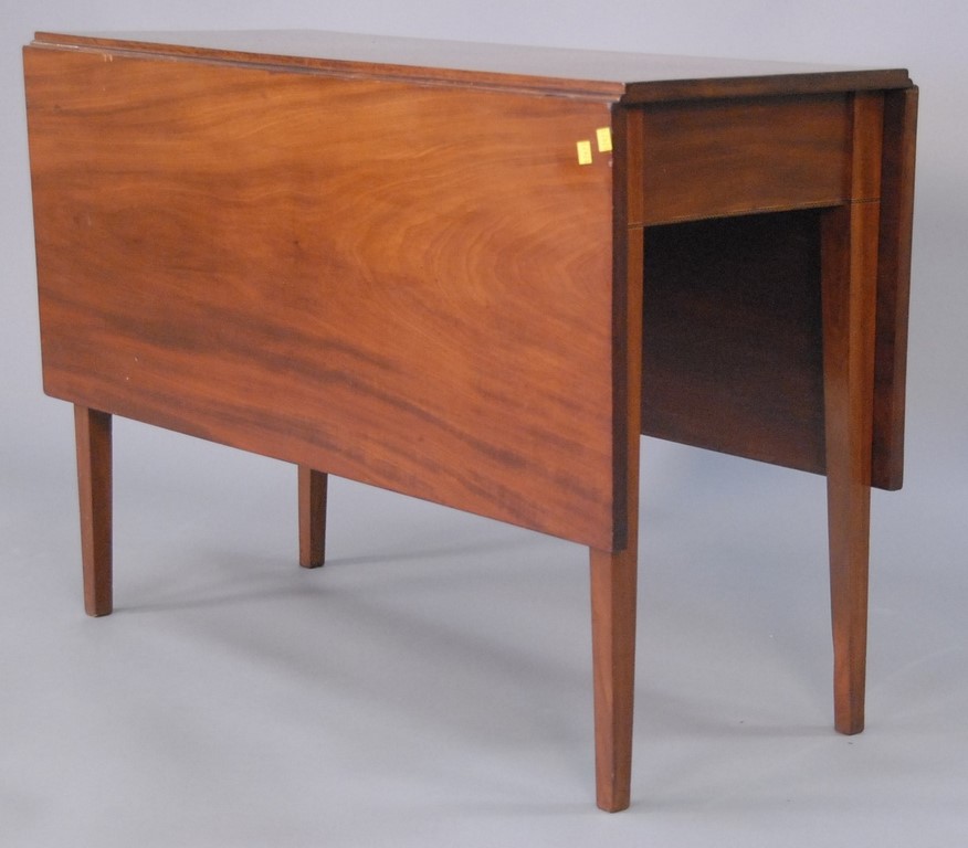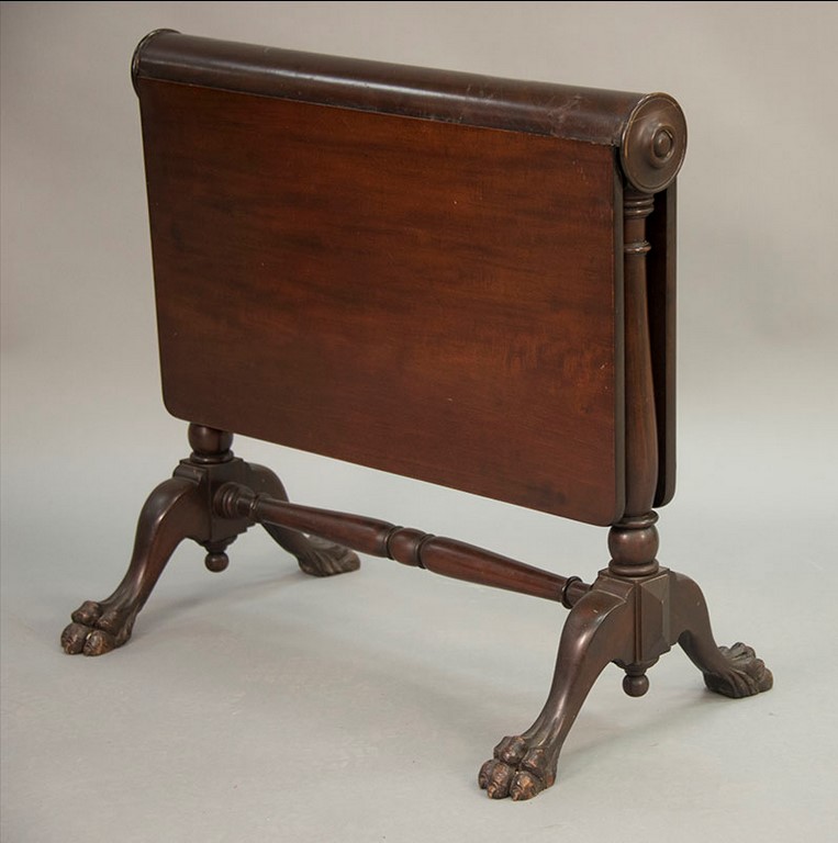 Mahogany Victorian drop leaf tuckaway table with roll top and rectangular drop leaves set on turned supports on downswept legs ending in claw feet, 19th century. ht. 30 1/4 in. top open: 31 x 34