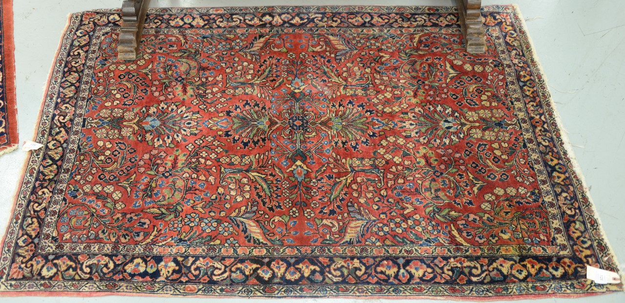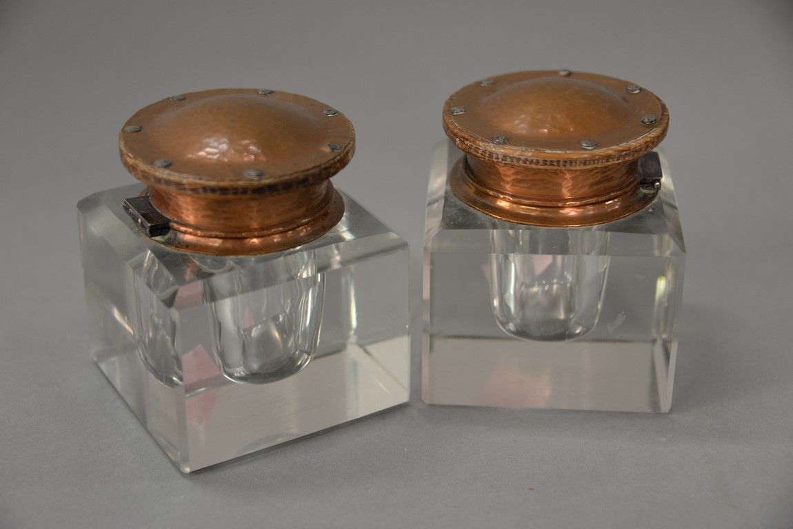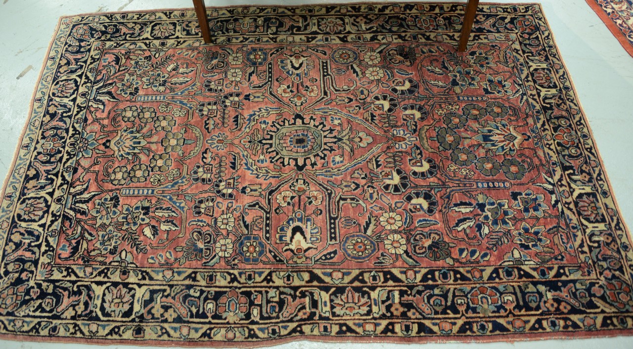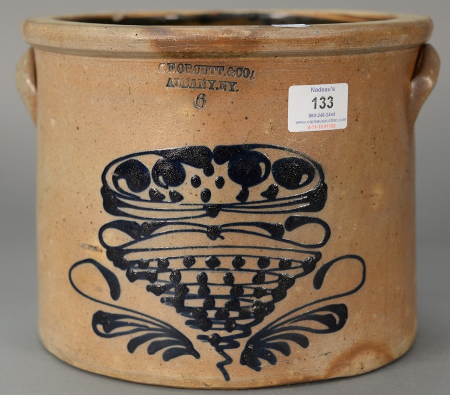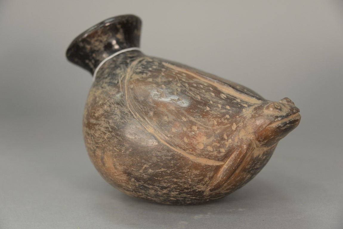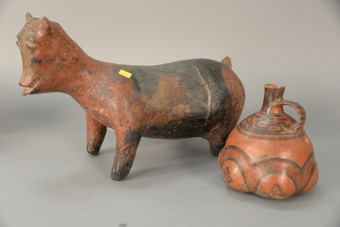 Two red clay pottery pieces including a dog and a vessel with black paint and handle .dog has crack and repair dog: ht. 10 1/2 in. lg. 17 1/2 in. vessel: ht. 6 in.