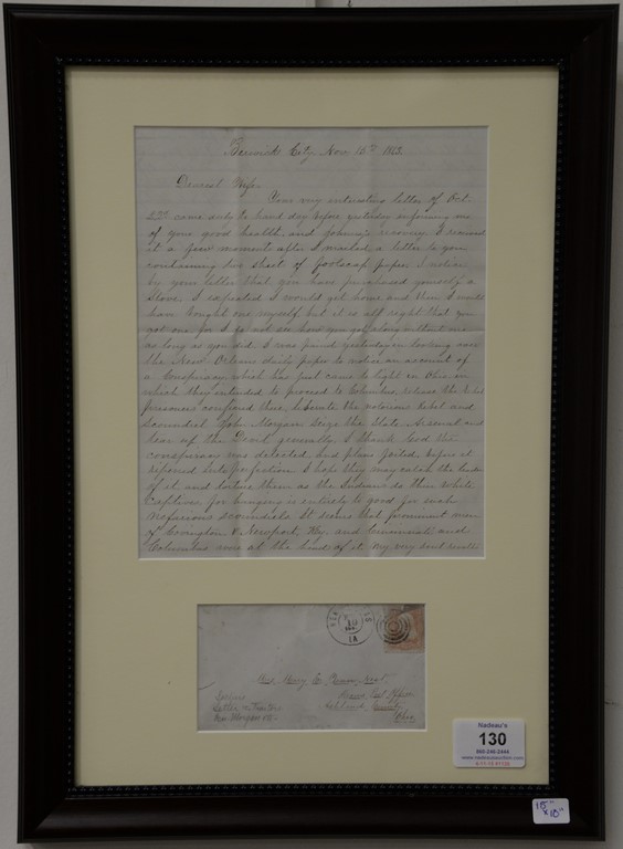 Autograph Letter J.P. Van Nest, 3 pages front and back, Berwick City, November 15, 1863, this letter is to his wife Mary in Ohio, with the stamped, autograph envelope, written after he learned of a plot in his home state. Van Nest writes …I was pained…to notice an account of Conspiracy which has just came to light in Ohio in which they intended to proceed to Columbus, release the rebel prisoners confined there, liberate the notorious Rebel and Scoundrel John Morgan, seize the State Arsenal and tear up the Devil generally…I hope they may catch the leaders…and torture them as the Indians do their white captives, for hanging is entirely too good for such nefarious scoundrels…If those men are so keen for war, why…do they not come down South and fight, here they can have war to their hearts content, but no those men…are not fighting men. I call them cowards…I took a solemn oath this beautiful Sabbath morning as I stood and listened to the Brass Band…to give me strength in obliterating every Rebel and Traitor both North and South… then he discusses the upcoming court martials of two deserters and his imminent departure for the Gulf of Mexico. 15 x 10