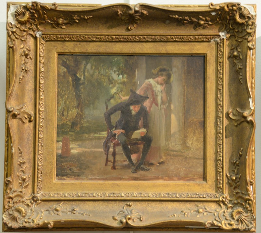 ATTRIBUTED TO MARCUS CLAYTON STONE 1840-1921 The Lads Letter oil on panel unsigned part of old paper label stating Sketch Marcus Stone in old faint writing on reverse 10 1/2 x 12 1/2