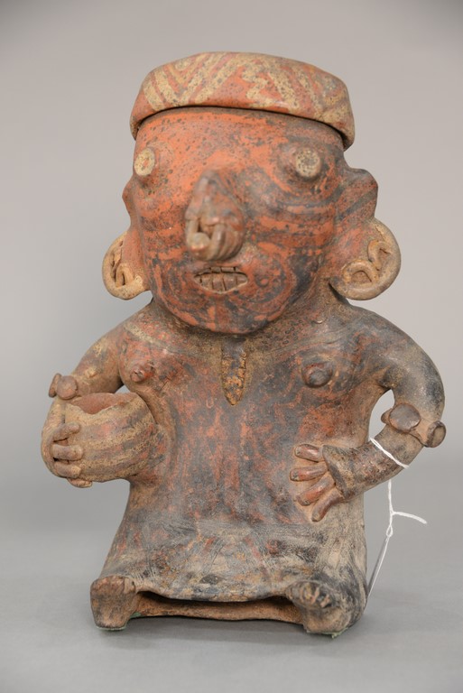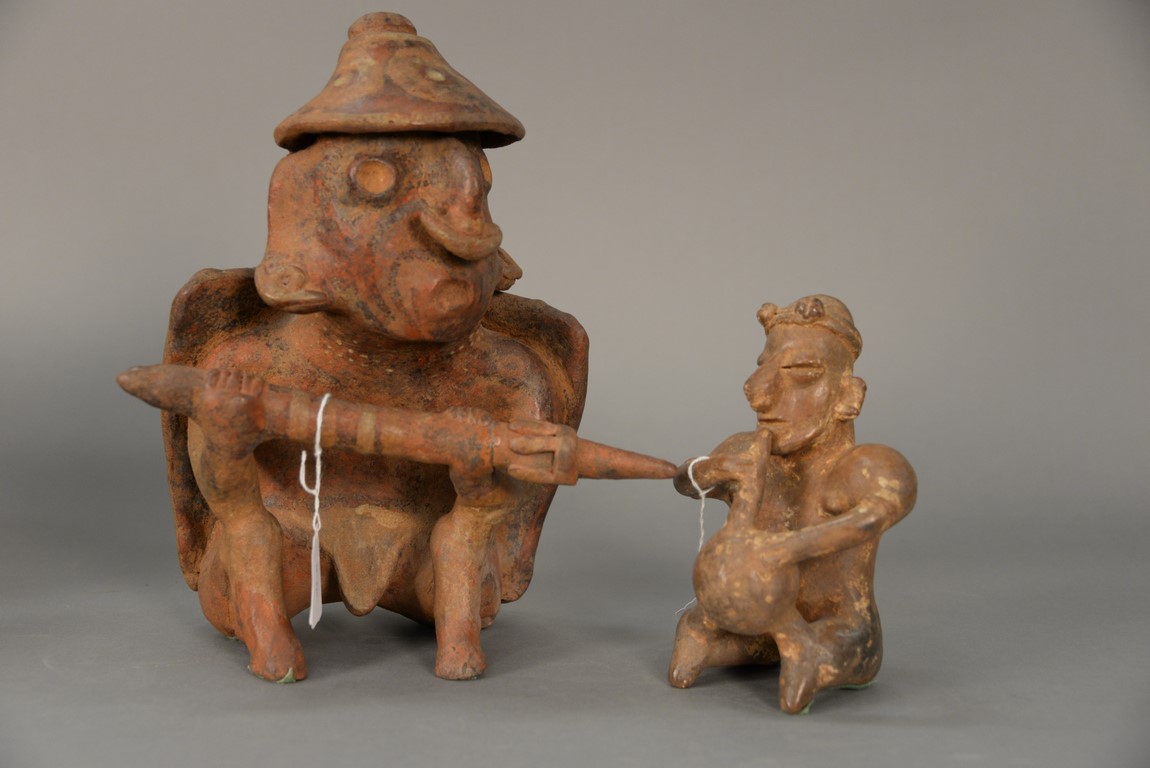 Two South American clay pottery figures, large paint decorated figure holding a spear and smaller figure holding a mixing bowl. ht. 12 in. ht. 6 1/2 in.