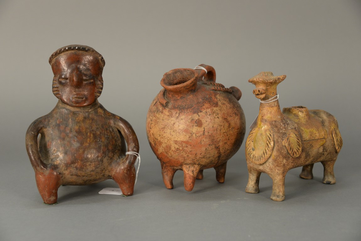 Four piece lot to include a carved mask and three Pre-Columbian and South American pottery vessel figures, one depicting a figure seated with hands on his knees, one having remnants of yellow glaze in the form of a four legged animal, and the last in the form of a bottle with a face. mask: ht. 13 in. vessels: ht. 6 1/2 in., ht. 8 in., and ht. 12 in.