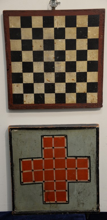 Two painted Folk Art game boards including one double sided painted with black and red checker board and mustard color border on one side and red, white, and blue Parcheesi on the other side having breadboard ends, the other board painted black and white with red border, 19th century. 13 x 13 and 13 1/4 x 13 1/2