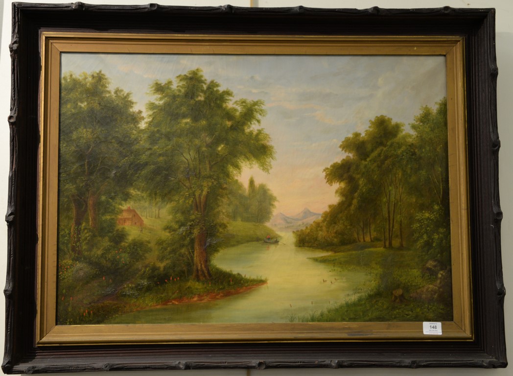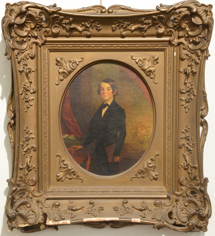 Portrait of a young man holding a book pillars and landscape background oil on canvas old paper label on reverse stating William Arden Maury, eldest child of John Walker and Isabel Foyles Maury, married Elizabeth Herndon Maury 10 1/4 x 8 1/4