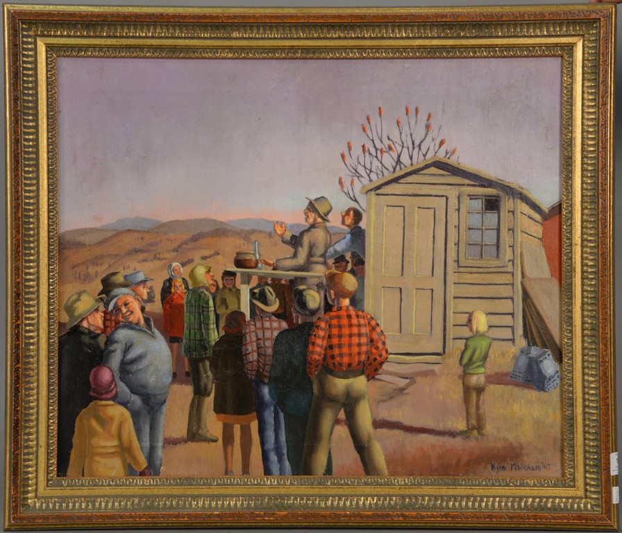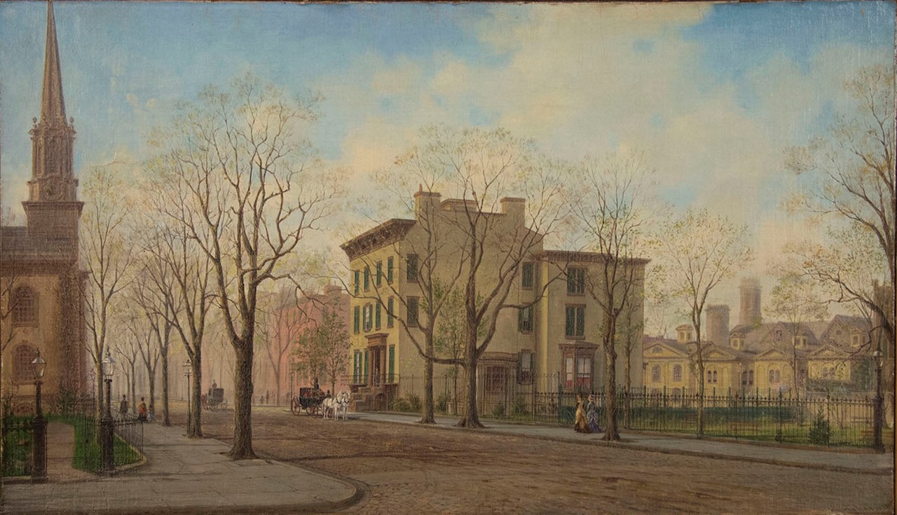 EDWARD LAMSON HENRY 1841-1919 The Home of Dudley Sanford Gregory oil on canvas signed lower right E. L. Henry 1865 16 x 27 Provenance: Mrs. Ernest Franklin Tyler France Gregory to current Consignor Reference: Photographic copy is in Frick Art Reference Library, N.Y. The Home of Dudley Sanford Gregory in Jersey City, New Jersey. Dudley was the first Mayor of Jersey City. Scene depicts Dudley S. Gregory’s home and Presbyterian Church at intersection of Washington and Sussex Streets at Washington Square and shows a tree lined street with Victorian iron fencing, horse drawn carriages, and several people.
