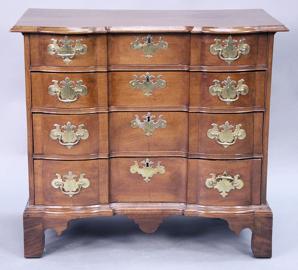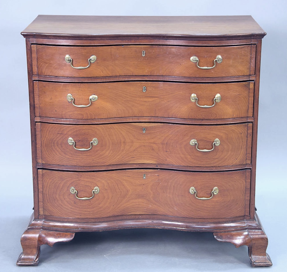 Chippendale cherry reverse serpentine chest having reverse serpentine top over four conforming drawers with block ends set on blocked ogee feet and quadrant blocking having original hardware, attributed to Eliphalet Chapin both back feet pieced. ht. 35 in. wd. 33 1/2 in. dp. 18 1/2 in. Provenance: Nathan Liverant & Son Estate of Sylvia Leven Included Documentation: Copy of Bill of Sale and photograph