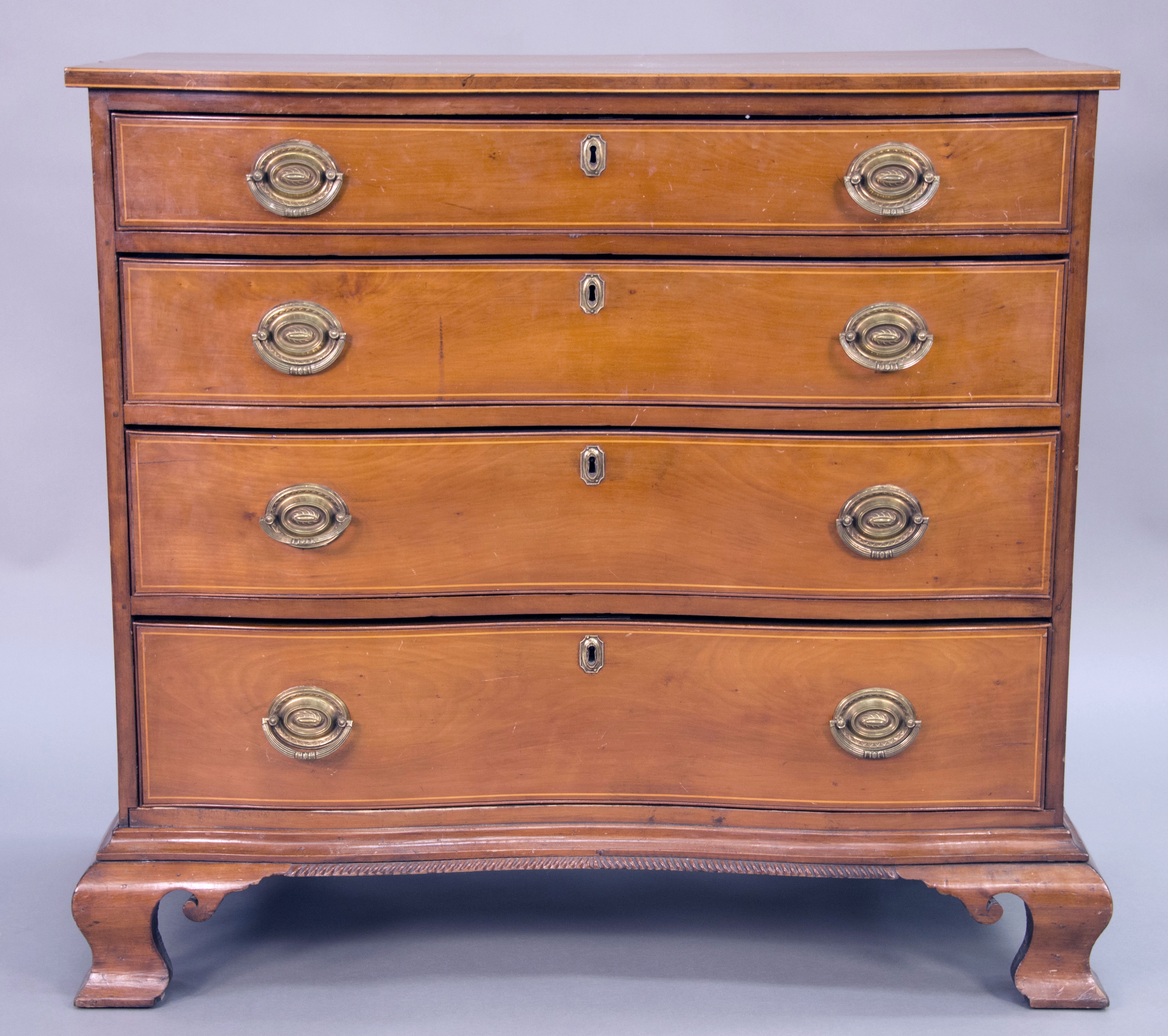 Chippendale cherry inlaid reverse serpentine chest having over-hanging top over four reverse serpentine graduated drawers having molded apron with center gadroon carved edge flanked by ogee bracket feet, probably Norwich, Connecticut circa 1780. ht. 36 3/4 in. case wd. 38 in. dp. 20 1/2 in. Provenance: Nathan Liverant & Son The Estate of Sylvia Leven Included Documentation: Copy of original Bill of Sale