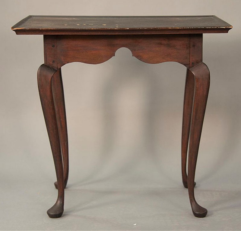 Queen Anne tea table having rectangular top with molded edges over carved skirt on cabriole legs ending in pad feet, 18th century top replaced. ht. 26 1/2 in. top: 28 1/4 x 20 1/4