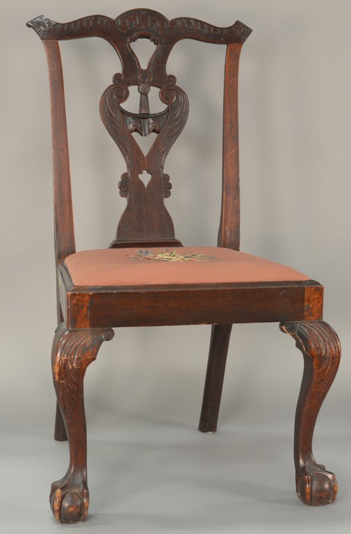 Chippendale mahogany side chair having carved crest rail and carved tassel back with slip seat all set on carved cabriole legs ending in ball and claw feet, 18th century restored. seat ht. 17 3/4 in. total ht. 38 1/2 in.