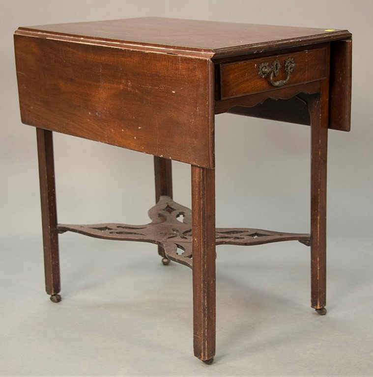 George III mahogany table with drop leaves, one drawer, and flat pierced stretcher on squared legs, 18th century. ht. 29 in. top closed: 17 1/2 x 27 1/2 top open: 36 1/2 x 27 1/2