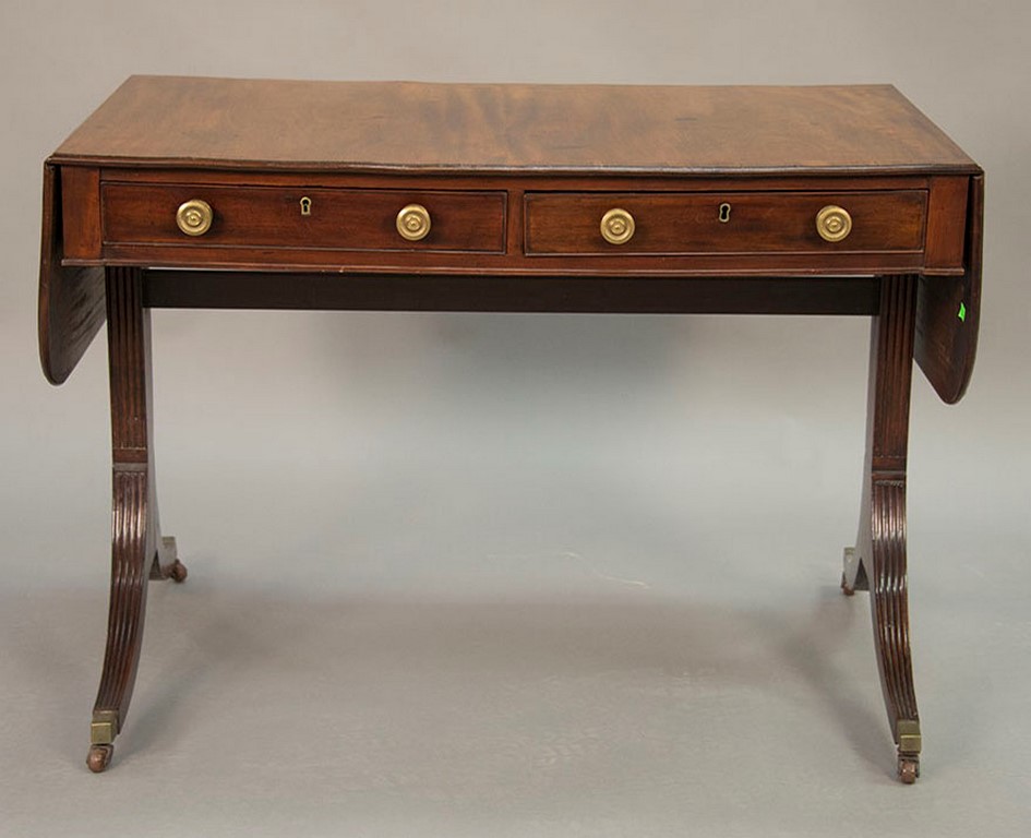 Regency mahogany inlaid sofa table having inlaid top with two drop leaves over frieze with two drawers on tressel supports set on reeded downswept members with brass feet and casters, circa 1830-1840. ht. 27 3/4 in. 24 x 62 top closed: 24 x 39 top open: 24 x 62 Included Documentation: Copy of original Bill of Sale Provenance: Nathan Liverant & Son to the Estate of Sylvia Leven