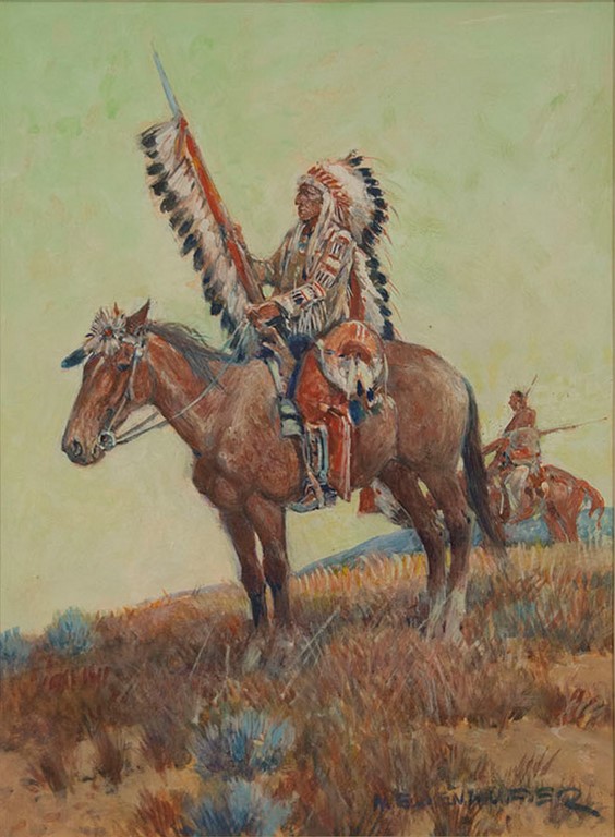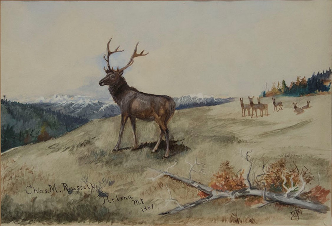 CHARLES MARION RUSSELL 1864-1926 Elk in the Rockies watercolor/gouache on paper signed lower left Chas. M. Russell Helena, MT 1887 monogrammed lower right CMR written on reverse: Purchased from the Cowboy Artist Chas. M. Russell at Helena, Montana May 12, 1887. sight size: 9 1/2 x 13 3/4 Provenance: Western Arts & Crafts Great Falls Montana 1968 Authenticated by Fred Renner, September 1968 Current Private Collection Included Documentation: Authenticity letter from Fred Renner, dated September 25, 1968, stating that the painting is authentic and originally purchased in 1887, that the unusual monogram-signature in the lower right corner is one the artist used in 1883 and 1884, and Paintings this early by Charles M. Russell are exceedingly rare. Original letter from Montana Historical Society dated July 26, 1968 in support of and agreeing with Renner’s Letter of Authenticity of this painting. Letter is signed by Curator Robert Morgan.