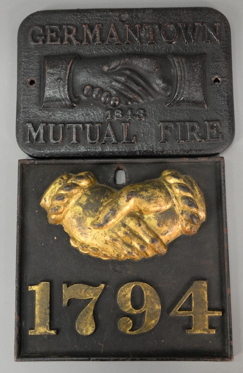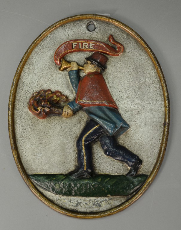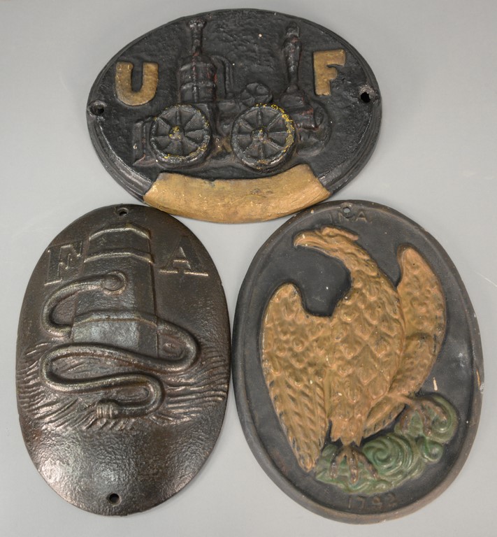 Three piece lot to include cast iron fire marks eagle over 1792 and a raised INA at top, cast iron fire mark FA with tank and hose, cast iron fire mark oval casting with a fire apparatus and marked UF. 11 x 8 1/2, 10 3/4 x 7 1/2, and 9 x 11 1/2