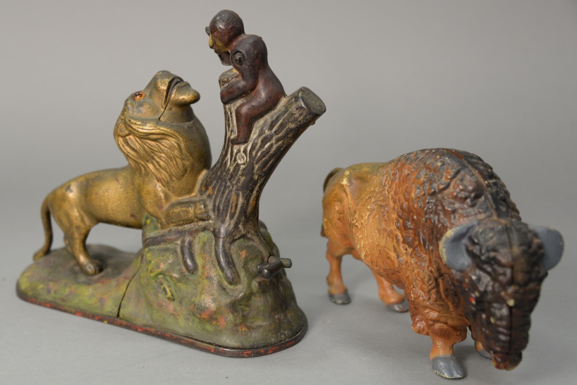 Two cast iron banks including Monkey and Lion mechanical bank and Bison/Buffalo still bank. lion: ht. 8 in. lg. 9 in. bison: ht. 5 1/2 in. lg. 7 1/2 in.
