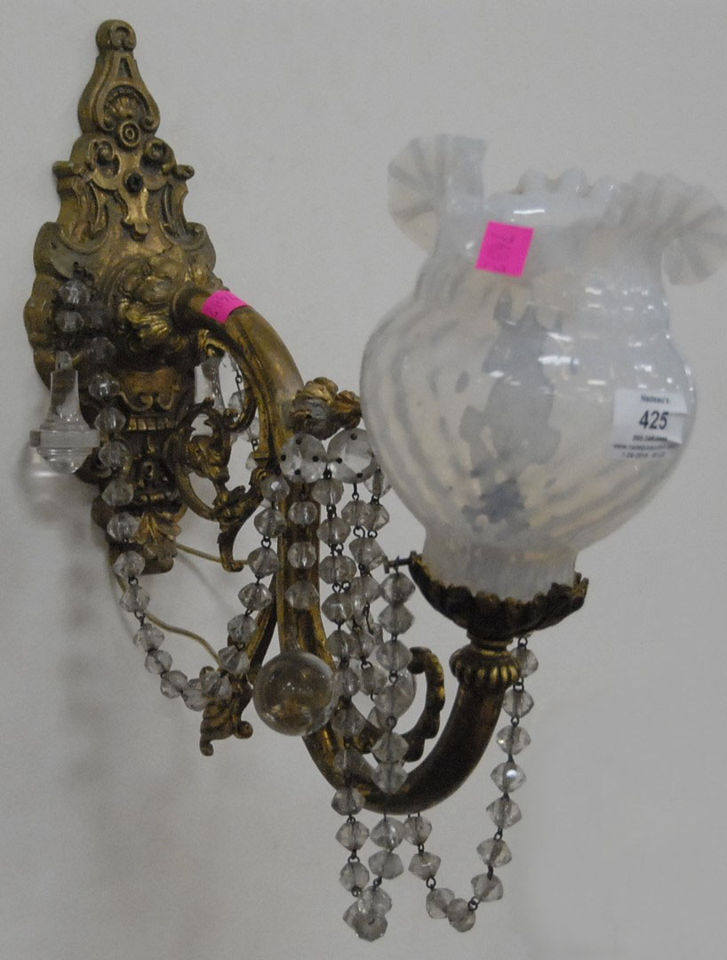Pair of brass wall sconces with embossed wall plaque mounted with brass decorated shaft, single light with opalescent shades, each with chained crystals. total ht. 13 1/4 in. dp. 11 1/2 in.