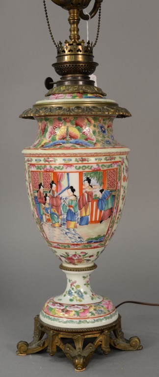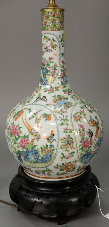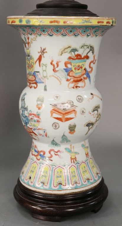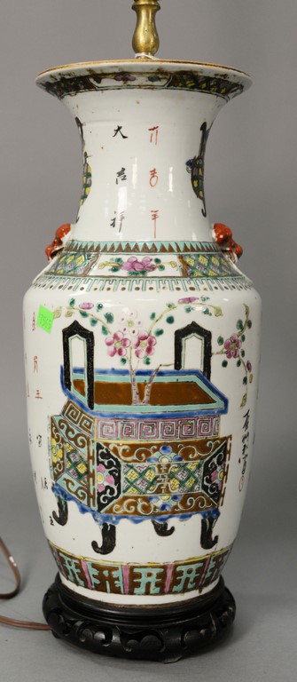 Famille Rose vase with painted scholar objects and vases of flowers, made into a table lamp, 19th century rim chips. vase ht. 14 in. total ht. 31 1/2 in.