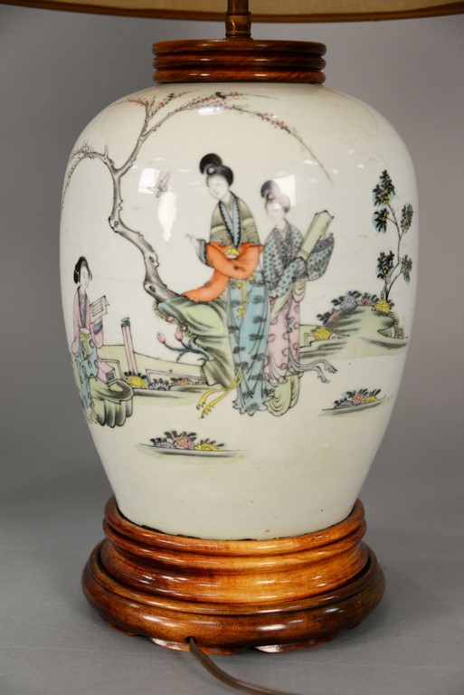 Chinese porcelain Famille Rose covered jar with three painted Guanyin figures by a tree on one side and signed on the back, made into table lamp. vase ht. 11 in. total ht. 28 in.