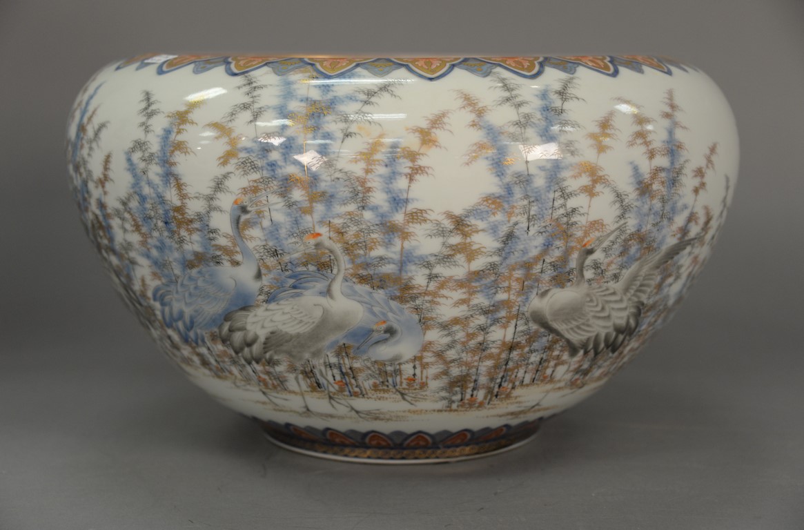 Large Imari fish bowl, exterior painted with blue and grey flying cranes amongst grey and gilt bamboo trees, interior having scrolling vines with blossoming flowers. ht. 9 1/2 in. dia. 16 in.