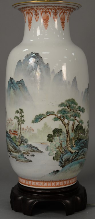 Chinese porcelain vase made into a table lamp having painted mountainous landscape on ocean’s edge and signed on back, Republic Period. vase ht. 17 in. total ht. 35 1/2 in.