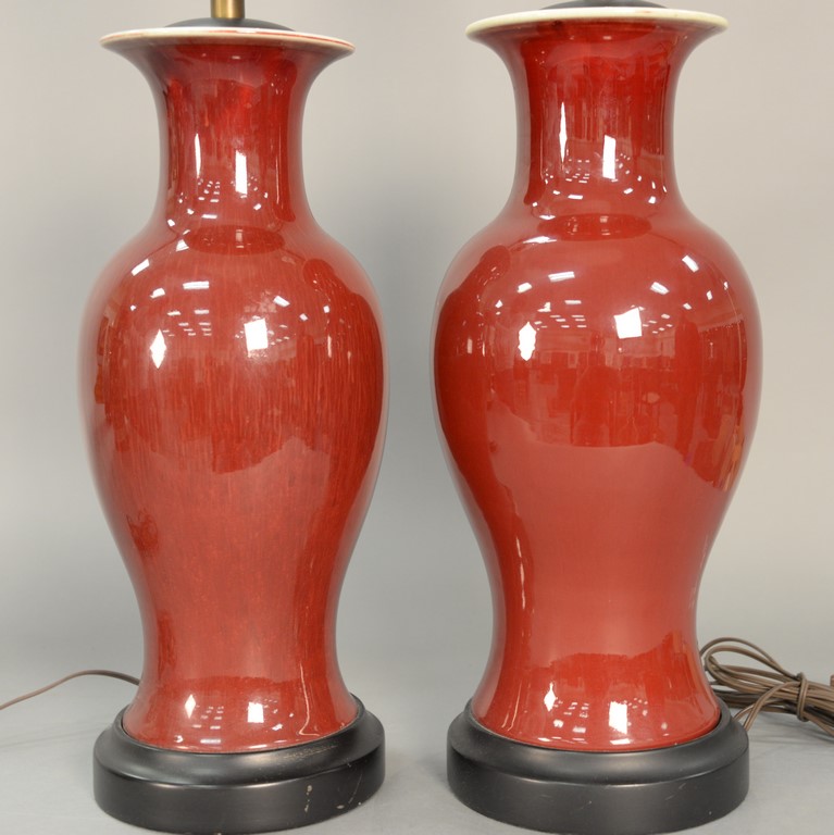 Pair of Chinese oxblood glazed porcelain vases in baluster shape with trumpet form top, both made into table lamps. vase ht. 18 in. total ht. 37 1/2 in.
