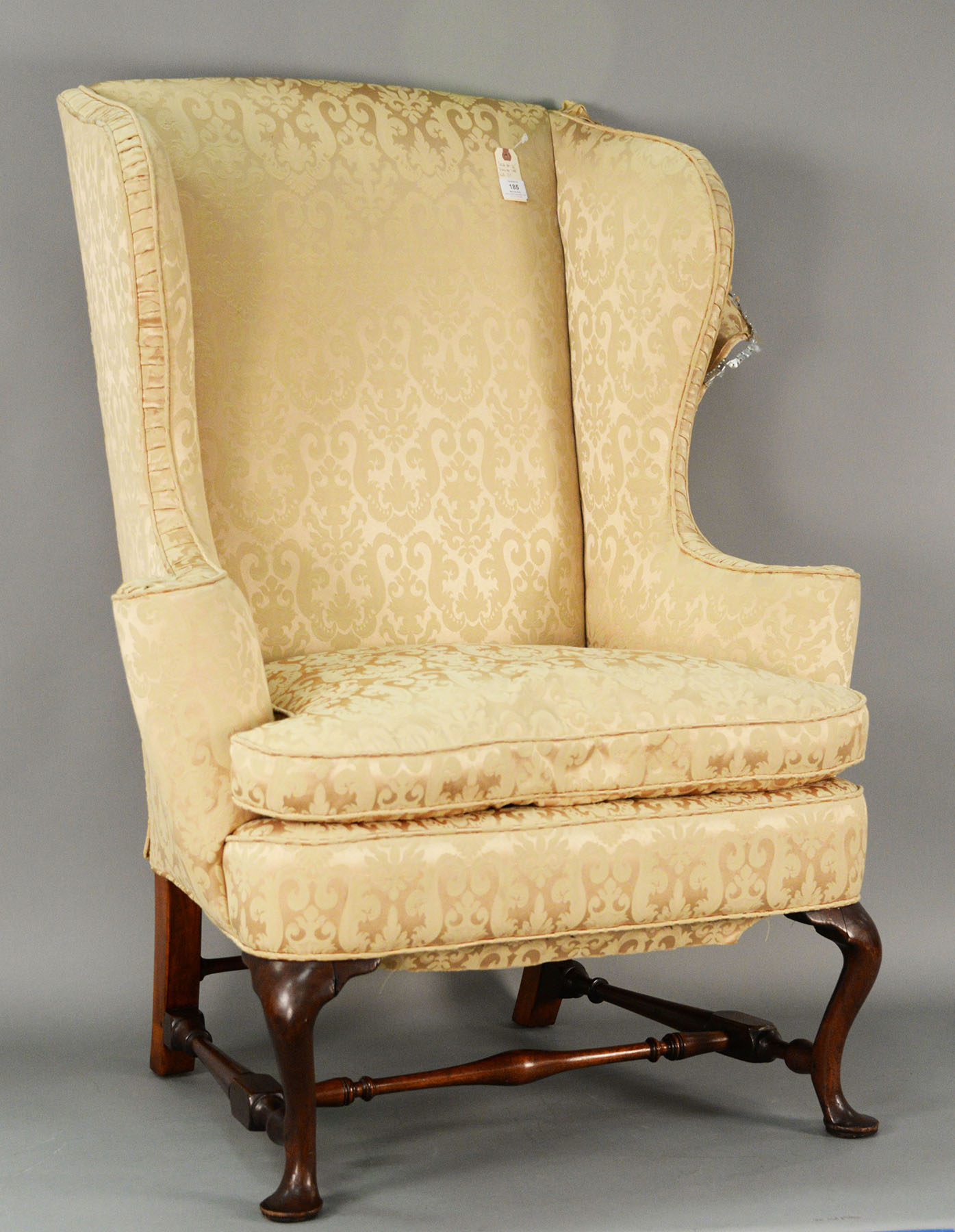 Walnut Queen Anne upholstered chair having winged back with large cones on plain D form seat set on cabriole legs joined by block and turned stretchers ending in pad feet, walnut and maple, New England circa 1740. seat ht. 15 3/4 in. plus cushion, ht. at back 48 in. wd. 37 in.