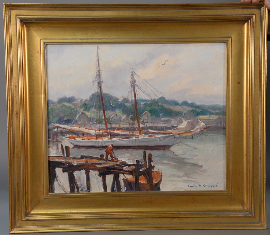 EMILE ALBERT GRUPPE 1896-1978 Ship in Harbour Harvey Gamage out of Bristol oil on canvas signed lower right Emile A. Gruppe titled and writing on reverse 20 x 24