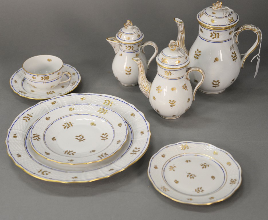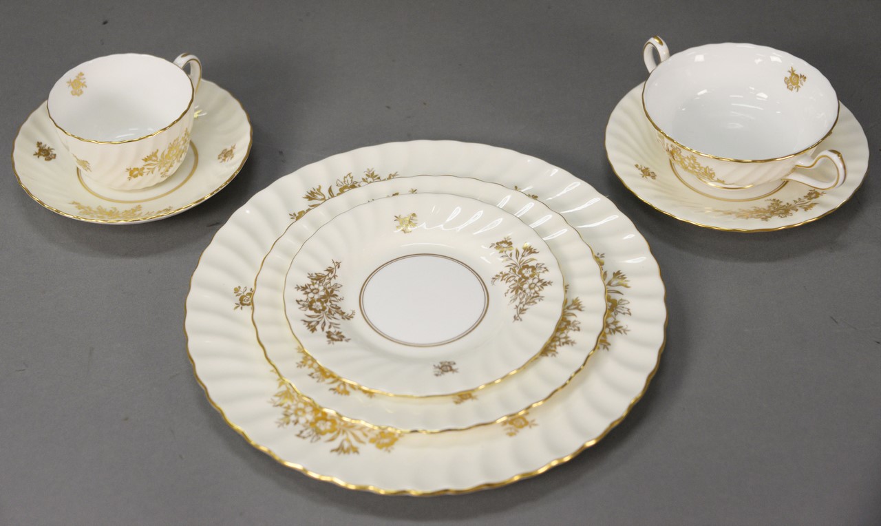 Minton dinnerware set marked Minton Bone China Made in England on bottom, service for 12 plus including 14 dinner plates, 12 dessert plates, 13 bread plates, 12 coffee cups, 12 saucers, 12 soups, 13 soup underplates, 1 sugar, 1 creamer, 4 nut dishes, and 2 serving plates, 96 total pieces