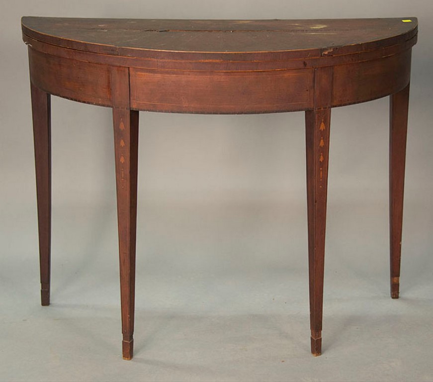 George III cherry demilune game table, top with half round panel inlay with ray lines opening to felt lined interior with line inlaid frieze set on bell flower inlaid square tapered legs, two swing legs, circa 1790-1810 top cracked. ht. 30 in. wd. 38 1/2 in. dp. 17 1/2 in.