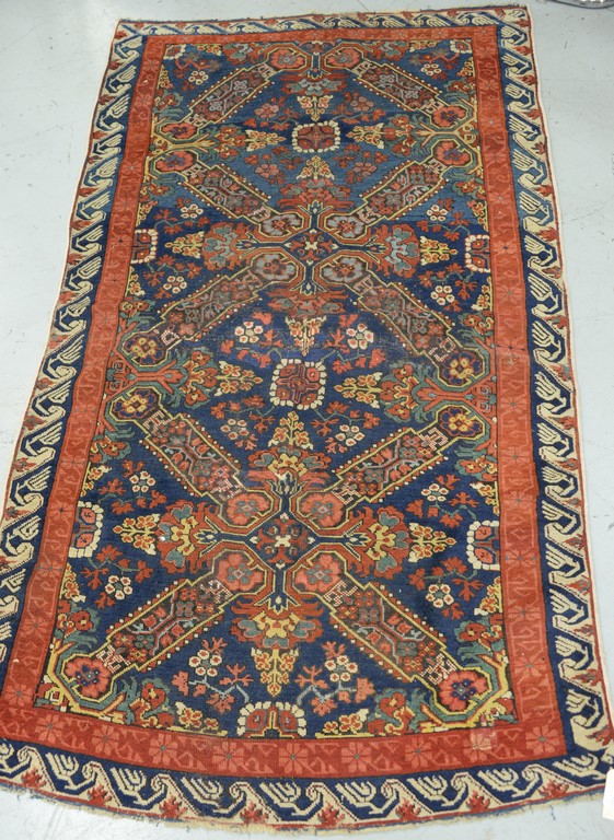 Chippendale corner cupboard in two parts, upper section with large cornice molding over door with twelve glass panels set on lower section with two blind doors on cut out bracket base. ht. 89 in. wd. 42 in.