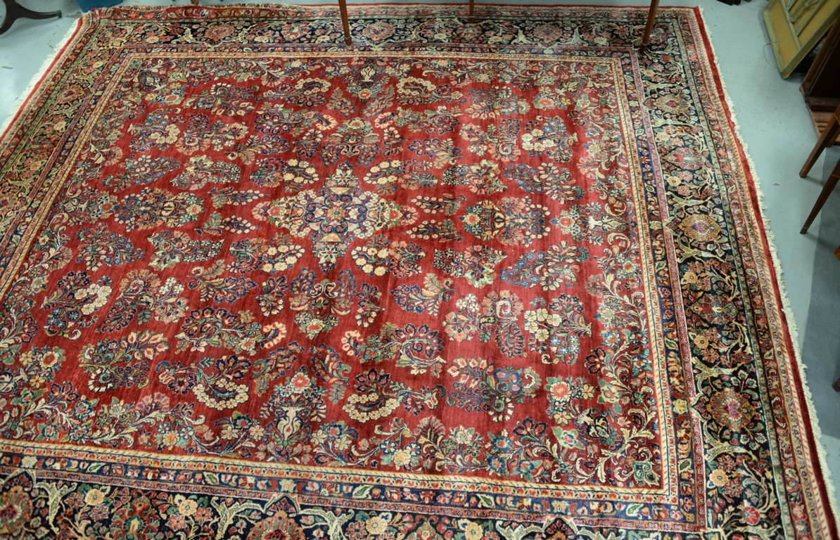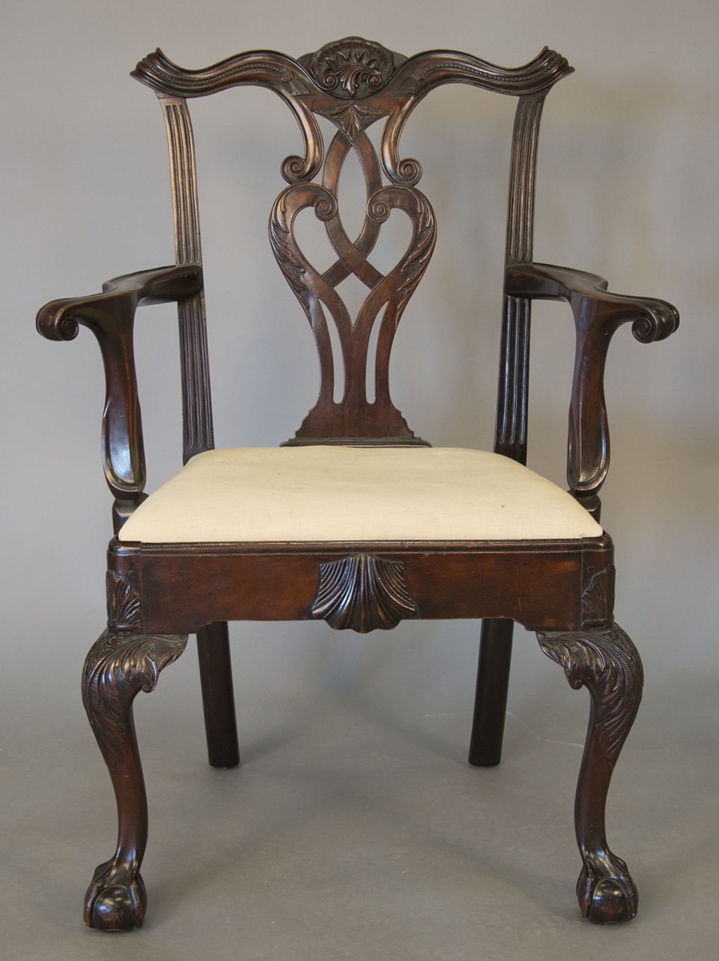 Mahogany Chippendale armchair having arched crest rail ornamented with carved rope and tassel motif and deeply scrolled ears with a center rocaille shell all over a pierced carved splat, the slip seat flanked by scrolled arms all set on cabriole legs with typical Philadelphia acanthus leaves carved on knees ending in ball and claw feet with central carved shell on seat rail. This chair is closely related to side chair in the Collection of Baltimore Museum pictured in American Furniture Book plate #13. seat ht. 17 1/2 in. total ht. 39 1/4 in.