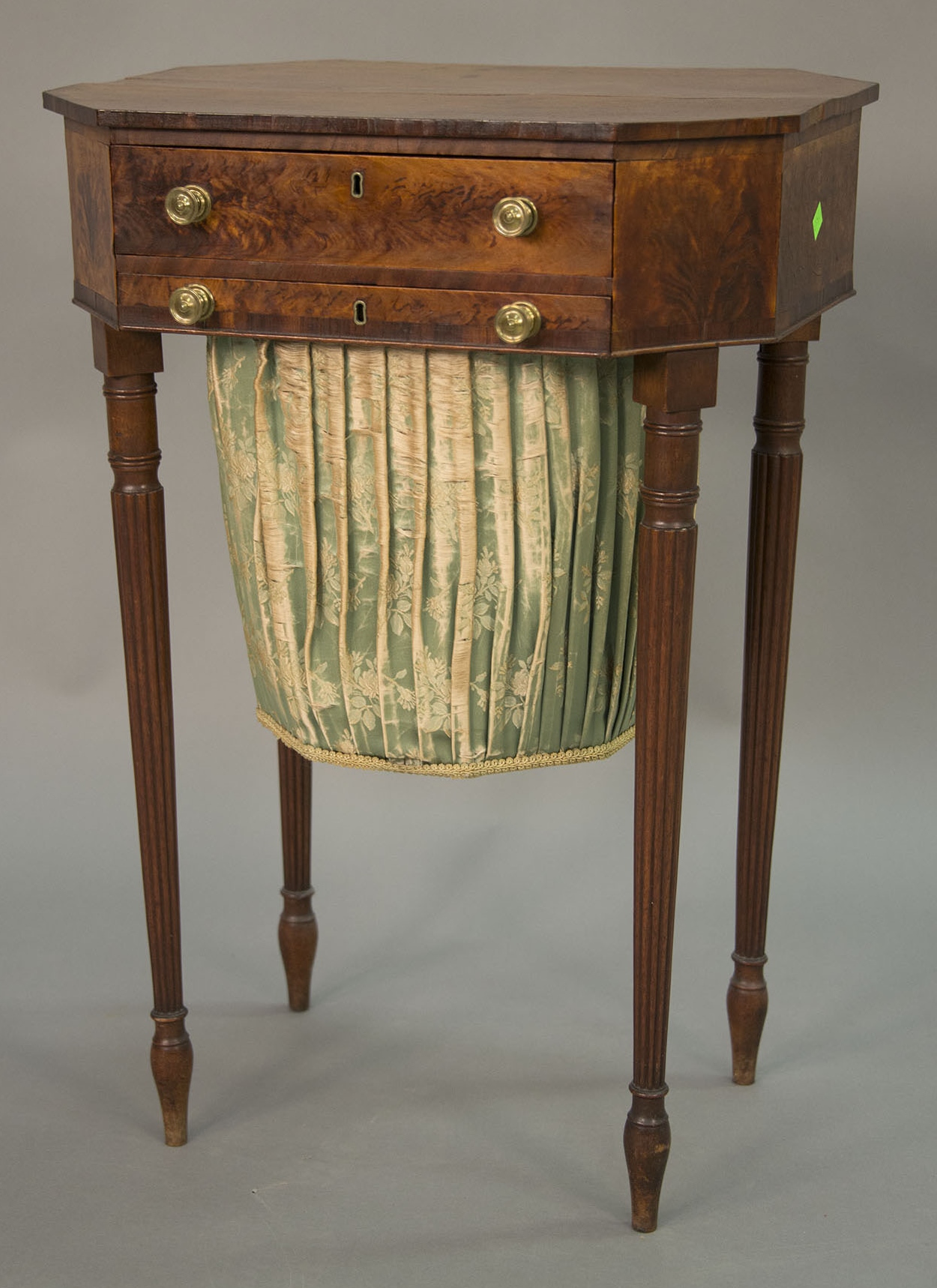 Federal mahogany inlaid work table having canted top over conforming case with one drawer plus a green damask bag drawer all on turned reeded legs, sides burlwood with inlaid panel top, probably Salem, Mass, circa 1800-1810 crack on top. ht. 29 1/2 in. top: 15 1/2 x 20 1/2 Illustrated in American Antiques from Israel Sack, Vol. V, Page 1332 Included Documentation: Original Bill of Sale from 1980 Original Israel Sack Inc. photographs #4340A Provenance: Collection of Charles K. Davis to Israel Sack Inc. The Estate of Sylvia Leven
