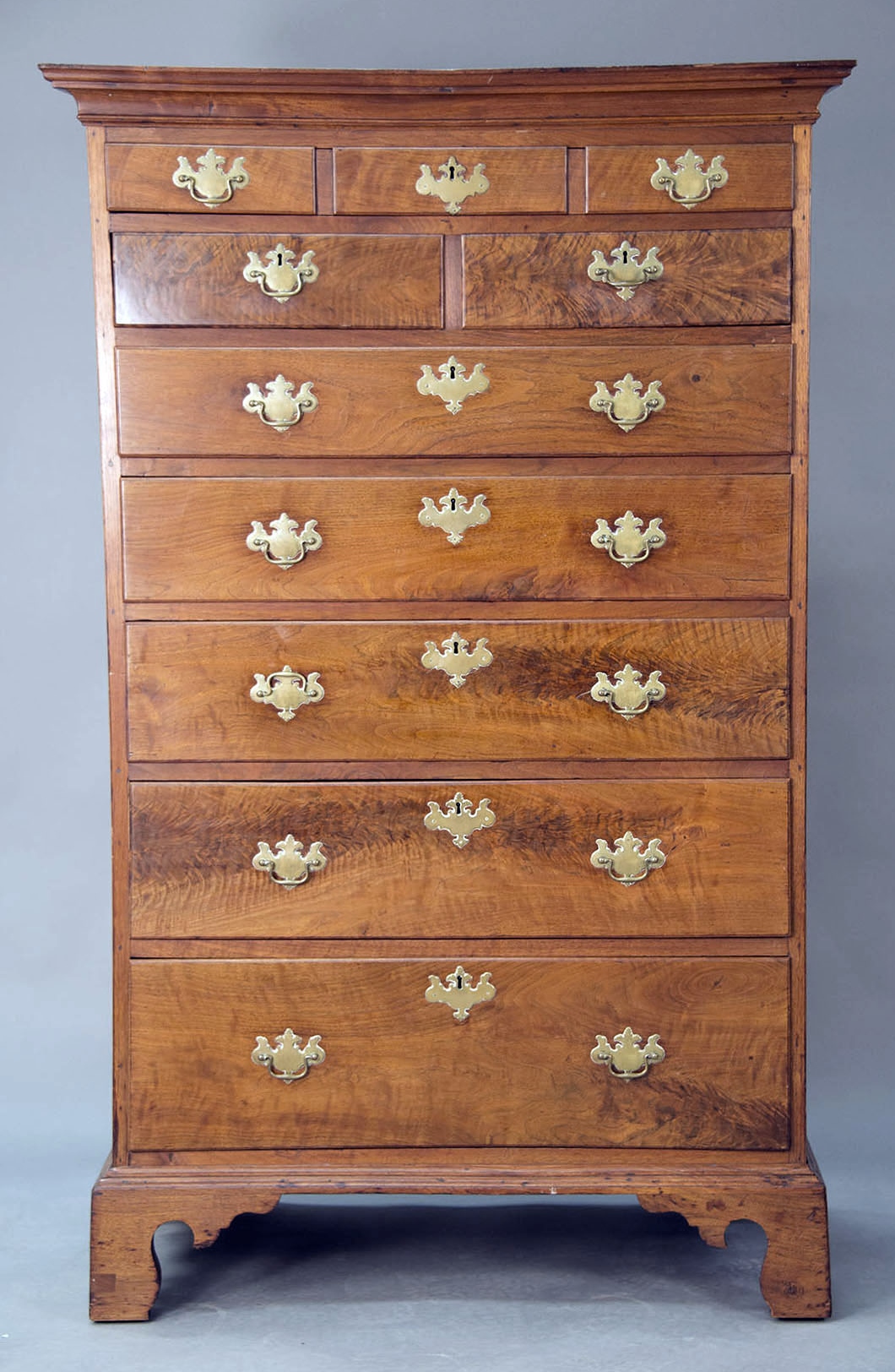 Seven drawer Chippendale walnut tall chest with large cornice molded top over faux three drawers over two short drawers over five drawers all on cut out bracket base, original brasses, Pennsylvania circa 1760. ht. 69 in. wd. 39 in. dp. 24 in.
