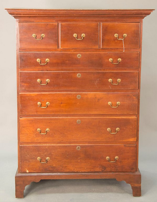 Chippendale tall chest having large cornice molded top over three drawers over double drawer over three drawers all set on cut out bracket base, 18th century. ht. 61 in. wd. 39 in. dp. 18 in.