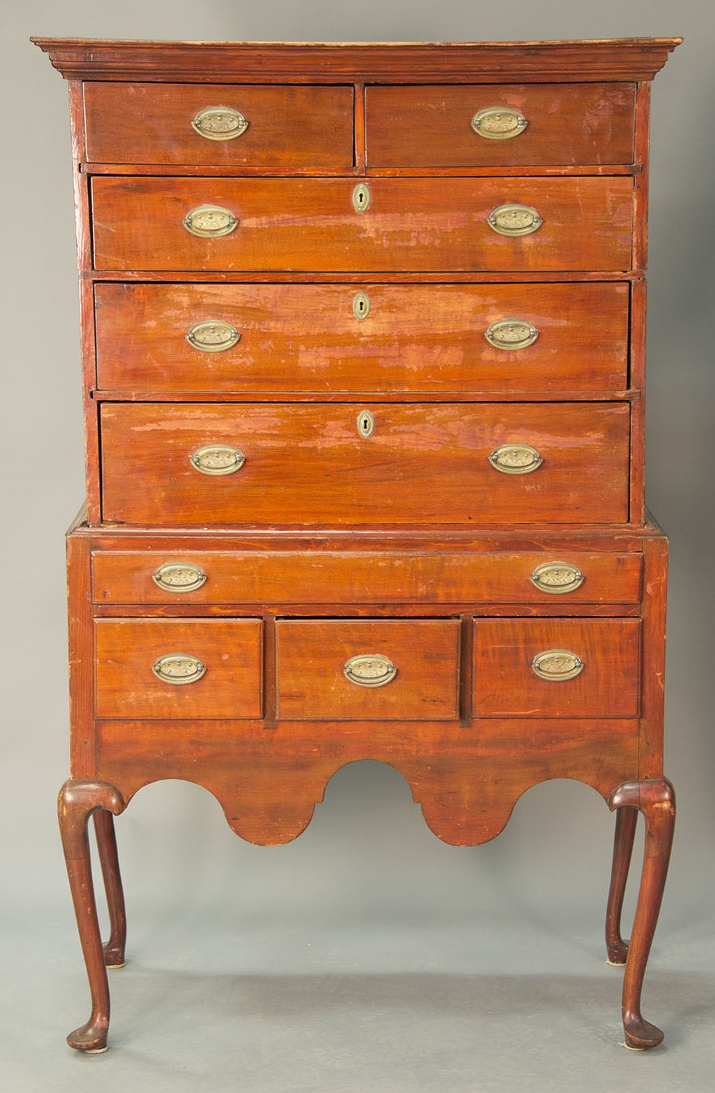 Queen Anne maple flat top highboy in two parts, upper section with two drawers over three drawers on lower portion with one long drawer over three short drawers with cyma carved skirt all set on cabriole legs ending in pad feet, 18th century married. ht. 65 in. wd. 38 3/4 in. dp. 20 1/4 in.