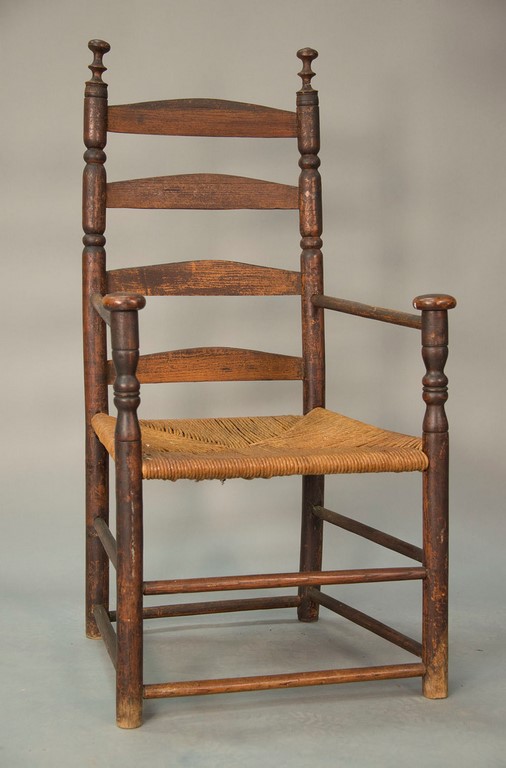 Ladderback great chair having turned finials, sausage turnings, four slats, and turned arms with mushroom hand supports on plain turned legs in old finish, late 17th to early 18th century woven seat replaced, one finial broken. ht. 42 3/4 in. seat ht. 16 1/2 in.