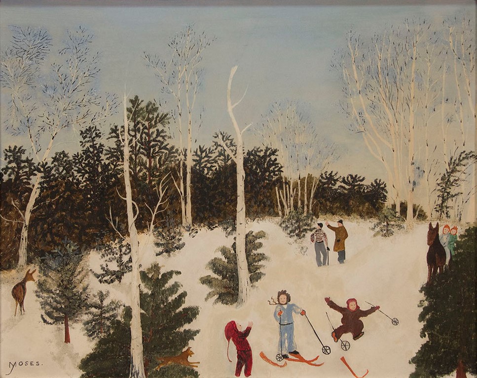 GRANDMA MOSES ANNA ROBERTSON 1860-1961 Untitled Skier Fallen with Deer and Man Snowscene gouache on artist board signed lower left Moses Label on reverse from Robert Elkon Gallery, 1063 Madison Ave, New York, N.Y. 15 1/4 x 19 1/2 Provenance: Robert Elkon Gallery, NY, 1971 Galerie St. Etienne, NY stamp Collection of JoAnn List Levenson Current Private Collection Included Documentation: Robert Elkon Gallery original bill of sale May 19, 1971