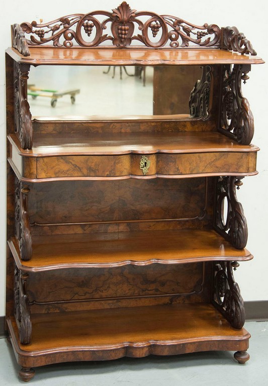 Victorian walnut and burl walnut etagere having grapes and scroll pierce carved gallery and sides, mirror back, and one drawer on turned feet. ht. 60 in. wd. 40 in. dp. 18 1/2 in.