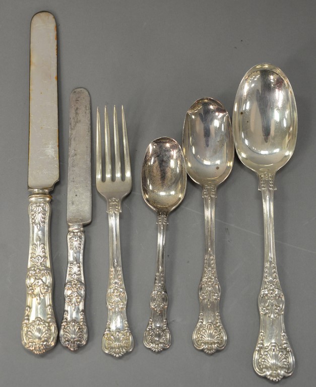 Reed & Barton Love Disarmed sterling silver partial flatware set comprising of 1 dinner fork, 8 luncheon forks, 8 salad forks, 16 teaspoons, 9 tablespoons, and 8 dinner knives, fifty pieces in total. 73.7 t oz. plus 8 knife handles