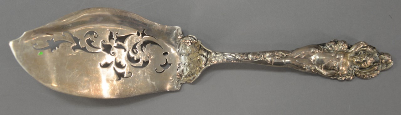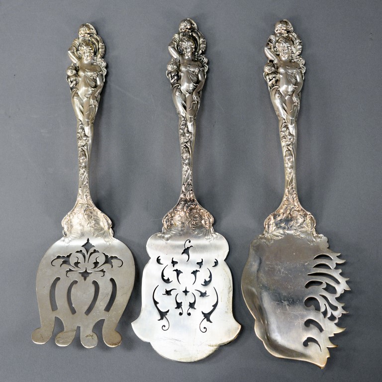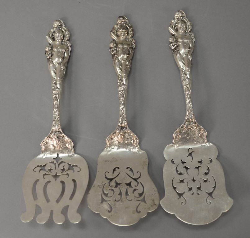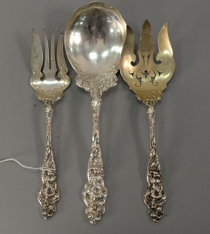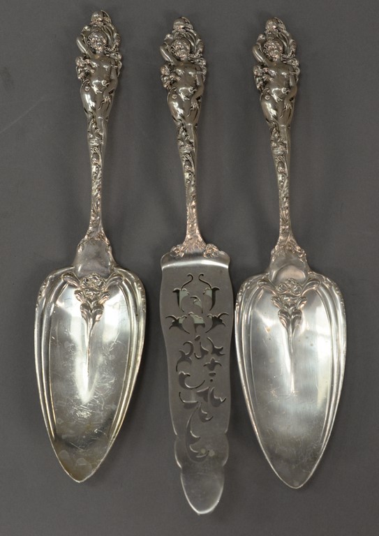 Reed & Barton Love Disarmed three sterling silver pieces including a waffle server lg. 11 1/4 in., asparagus server lg. 10 3/4 in., and macaroni server, lg. 11 1/4 in. 22.3 t oz.